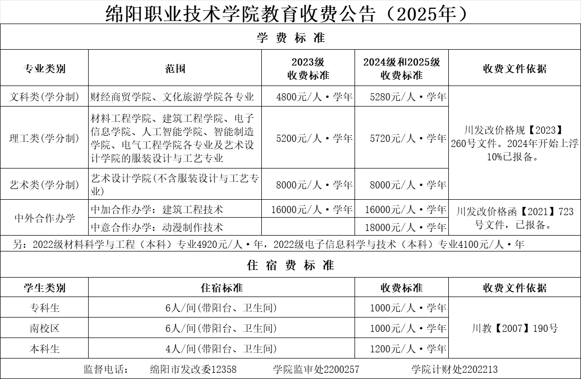根据省厅有关政策,现将绵阳职业技术学院2025年教育收费标准予以公告。